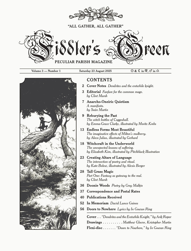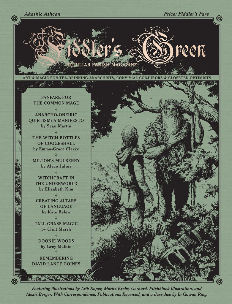 Fiddler’s Green 9 features copper titling, a cover drawn by Arik Roper, and 56 pages of art and magic, including reviews, a letters column, and the following: