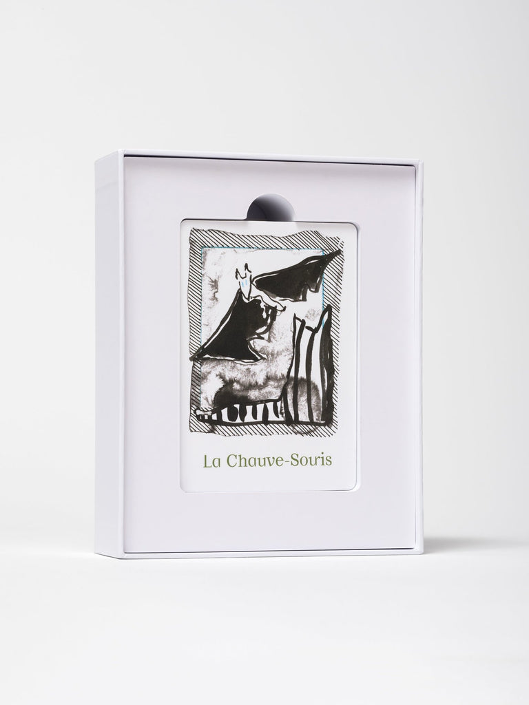 The Itinéraires Fantômes deck consists of 72 cards in six categories: animots, creatures, and entities that include Those from Below, Those from Above, Those Who Fly/Steal, who travel via Portals, manipulate Messages and Symbols, and have Superpowers. The cards are accompanied by a booklet in English and French.
